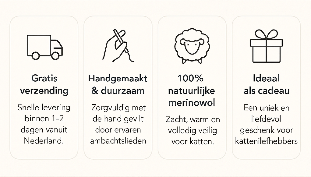 Merinowol is warm, zacht en ademend. Het vormt zich naar het lichaam van je kat en geeft een veilig, geborgen gevoel. -